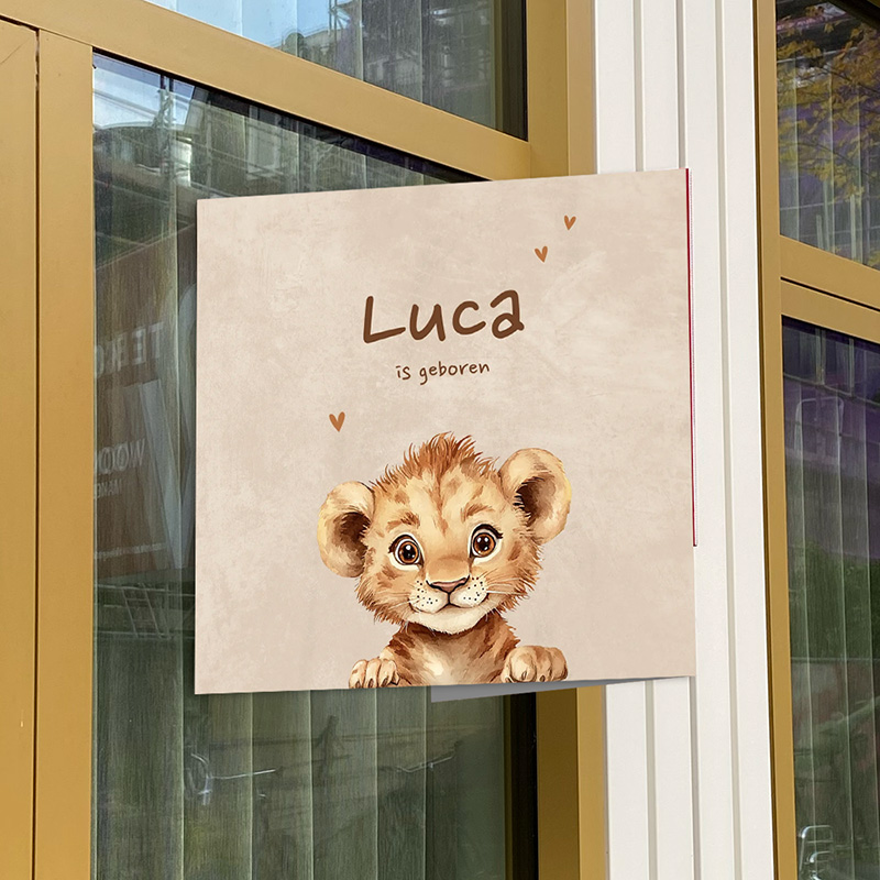 Beige geboortebord van 50x50 cm met lief leeuwtje dat over het randje kijkt. Dit bord past perfect bij dit geboortekaartje. Bevestig dit geboortebord op het raam met de zuignappen en de hele buurt weet gelijk dat er bij jullie een kindje geboren is.