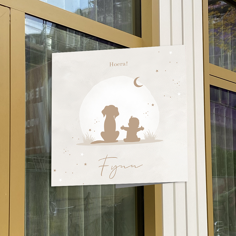 Vierkant beige geboortebord van 50x50 cm met silhouetjes van een hondje en baby. Dit bord past perfect bij dit geboortekaartje. Bevestig dit geboortebord op het raam en de hele buurt weet gelijk dat er bij jullie een kindje geboren is.