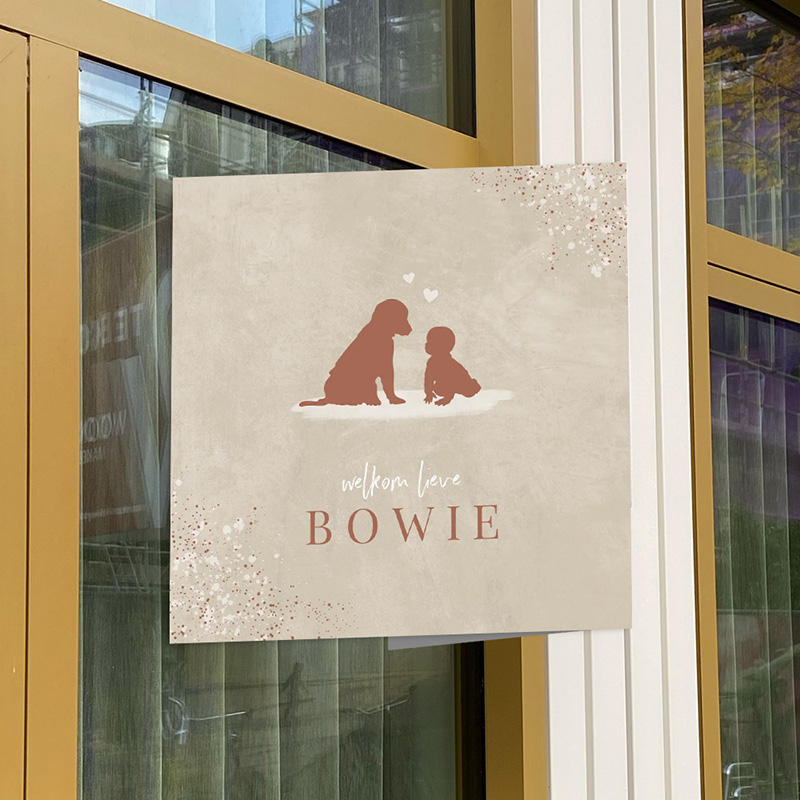 Dit beige geboortebord van 50x50 cm met silhouet kindje en hondje past perfect bij dit geboortekaartje. Bevestig dit geboortebord op het raam en de hele buurt weet gelijk dat er bij jullie een kindje geboren is.