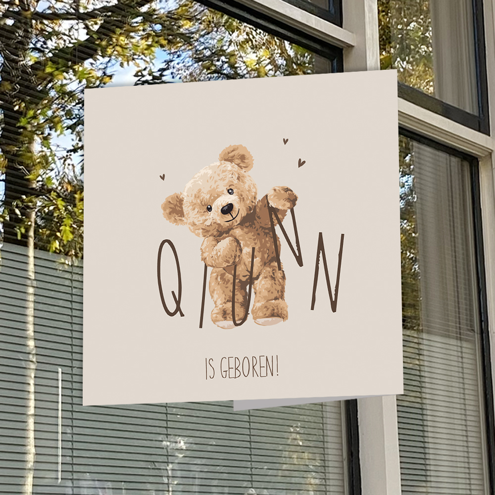Dit vierkante beige geboortebord van 50x50 cm met bruine teddybeer die de naam van je kindje vasthoudt. Dit bord past perfect bij dit geboortekaartje. Bevestig dit geboortebord op het raam en de hele buurt weet gelijk dat er bij jullie een kindje geboren is.