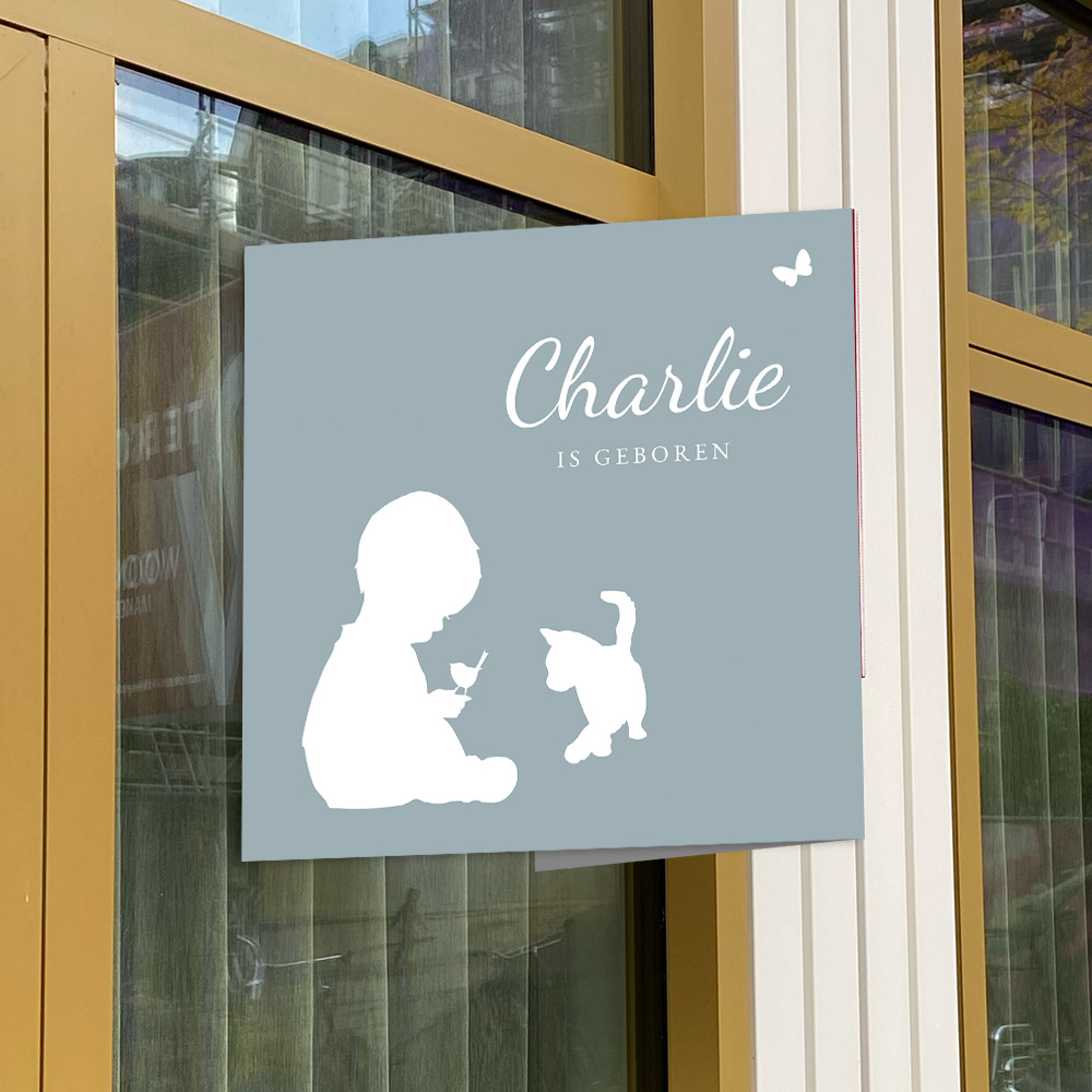 Dit vierkante, blauwe raambord van 50x50 cm met silhouet jongetje, vogeltje en kat past perfect bij dit geboortekaartje. Bevestig dit geboortebord op het raam om de hele buurt te laten weten dat er bij jullie een kleine jongen geboren is. Pas dit bord aan naar eigen wens in onze handige editor.