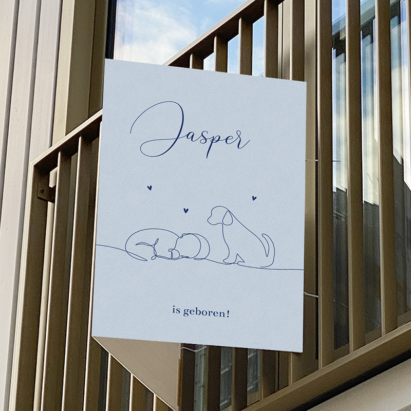 Dit staande, beige geboortebord van 40x60 cm met een lijntekening van baby met hondje past perfect bij dit geboortekaartje.