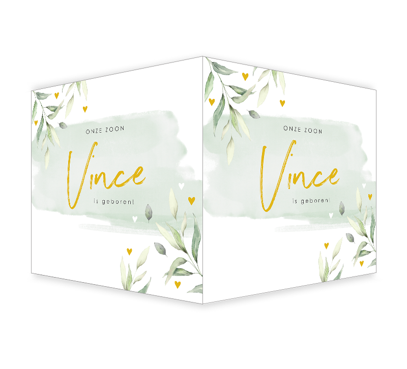 Vierkant geboortebord met groene bladeren en pastelgroene waterverf. De okergele hartjes en naam maken het ontwerp helemaal af. Bevestig het raambord aan je raam en maak de geboorte van je dochter wereldkundig. Pas het bord zelf verder naar wens aan.