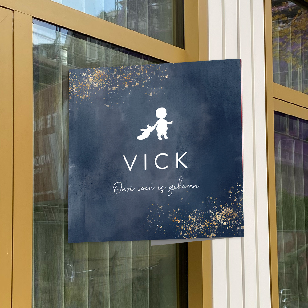 Is jullie zoontje geboren en wil je dit van de daken schreeuwen? Kies dan voor dit donkerblauwe raambord met goudkleurige spetters en wit silhouet van een jongetje met beer. Pas de naam eenvoudig aan met de ontwerptool.