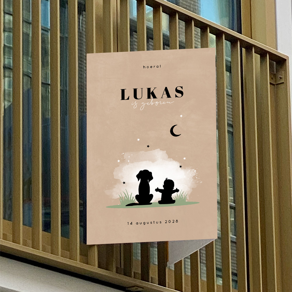 Maak de geboorte van je zoontje bekend met dit zandbruine geboortebord. Je ziet een zwart silhouet van een jongen met daarnaast een hondje. Het ontwerp is versierd met maan en sterren. Pas dit raambord van 40x60 cm zelf aan in onze handige ontwerptool.