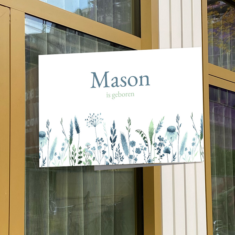 Dit liggende, witte geboortebord van 60x40 cm met groene en blauwe waterverf bloemen past perfect bij dit geboortekaartje. Bevestig dit geboortebord op het raam en de hele buurt weet gelijk dat er bij jullie een jongetje geboren is.