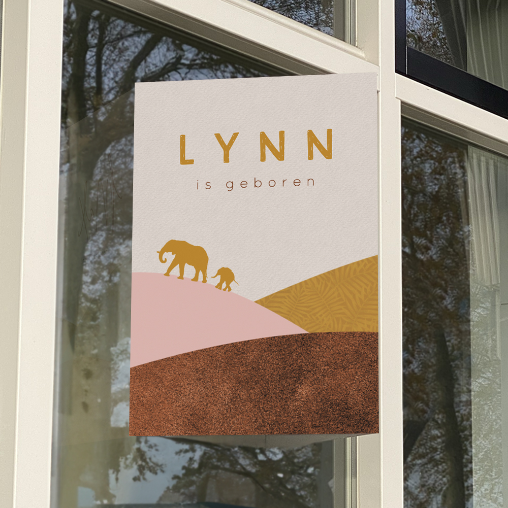 Dit rechthoekige raambord van 40x60 cm met minimalistisch landschap en twee olifantjes past perfect bij dit geboortekaartje. Bevestig dit geboortebord op het raam om de hele buurt te laten weten dat er bij jullie een klein meisje geboren is. Pas dit bord aan naar eigen wens in onze handige editor.