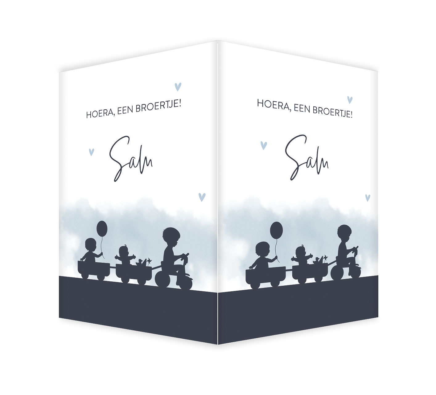 Op zoek naar een mooi geboortebord voor de aankondiging van je derde kindje? Kies voor dit hippe raambord met donkerblauwe silhouet. Je ziet drie kindjes, de oudste voorop op de fiets en de twee jongste erachter in de bakjes. Neem een kijkje in de map "silhouet familie" en pas de illustratie aan naar wat bij jullie gezinssamenstelling past.