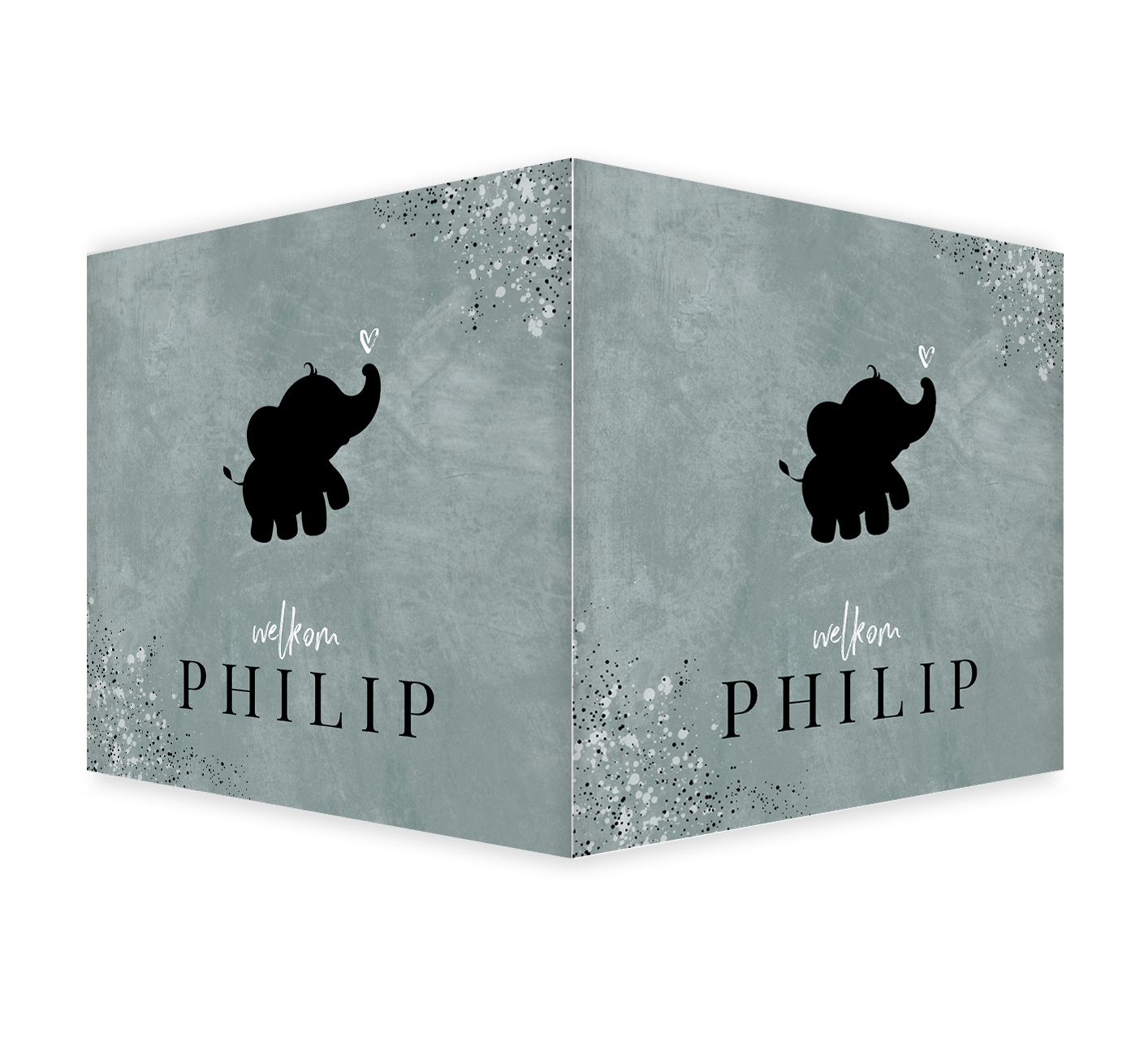 Dit vierkante, grijsblauwe geboortebord van 50x50 cm met silhouet olifantje en klassieke naam past perfect bij dit geboortekaartje. Bevestig dit geboortebord op het raam en de hele buurt weet gelijk dat er bij jullie een jongetje geboren is.
