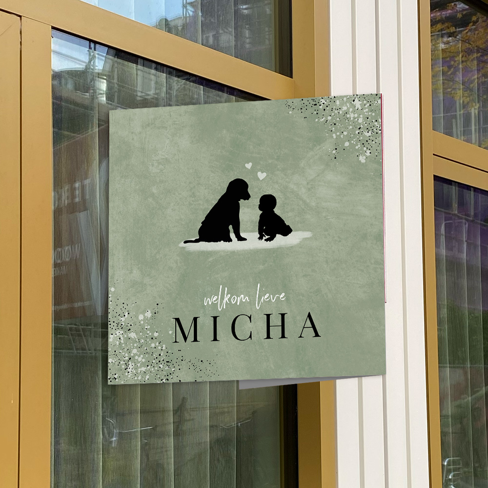 Dit vierkante, groene geboortebord van 50x50 cm met silhouet kindje en hondje past perfect bij dit geboortekaartje. Bevestig dit geboortebord op het raam en de hele buurt weet gelijk dat er bij jullie een kindje geboren is.