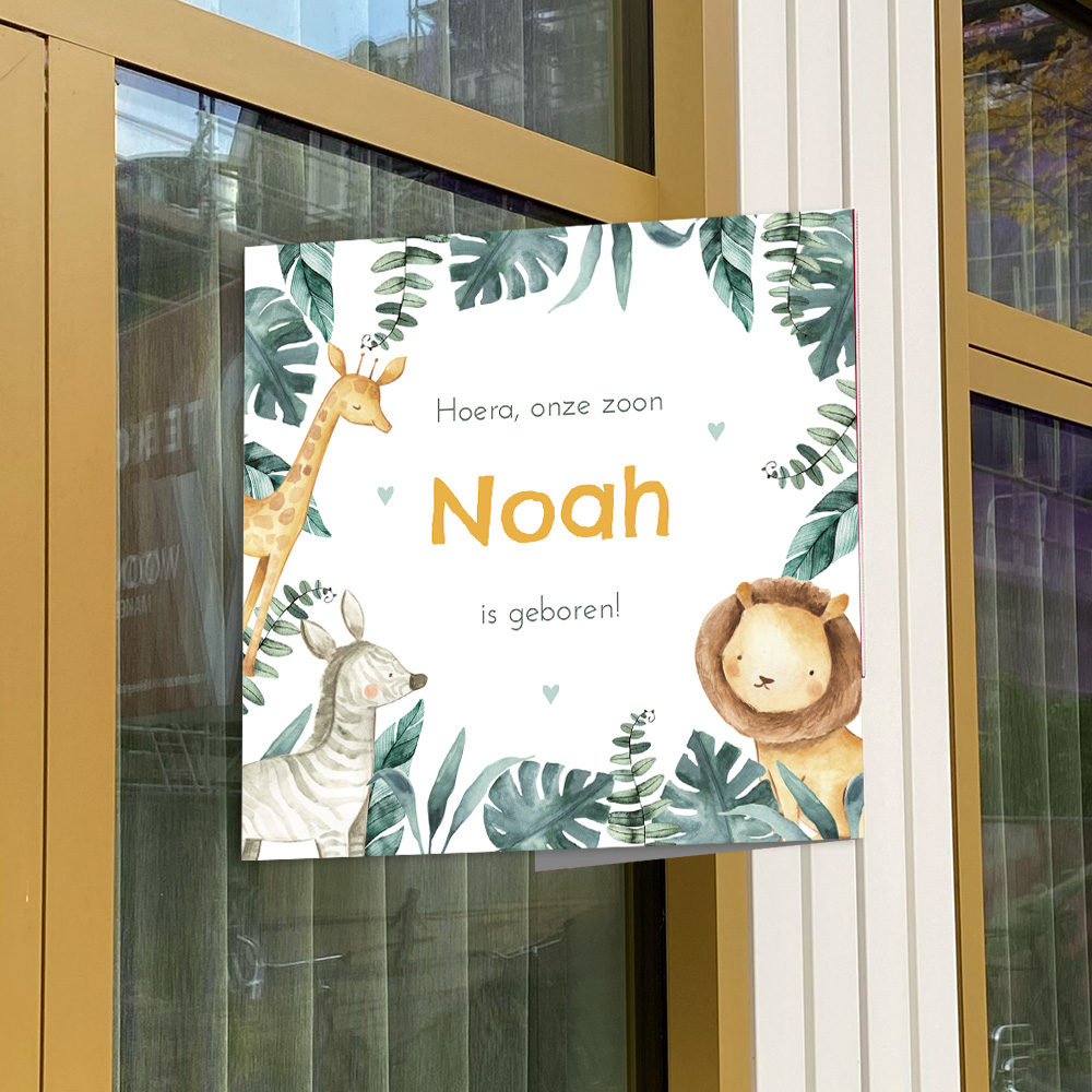 Maak de geboorte van je zoontje bekend met dit stoere geboortebord. Het ontwerp heeft een rand van tropische bladeren. Tussen de bladeren zitten allerlei wilde dieren verstopt, zoals een giraf, leeuw en een zebra. Dit raambord is gepersonaliseerd met de naam van jullie pasgeboren zoontje. Pas deze zelf aan met de ontwerptool.