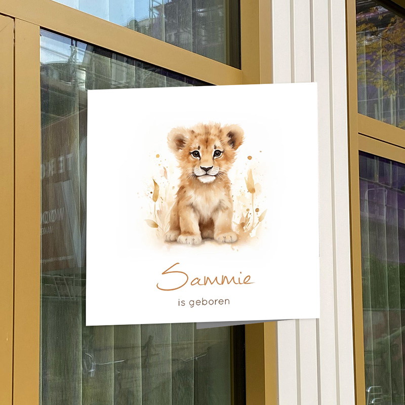 Dit vierkante geboortebord van 50x50 cm met waterverf illustratie van een leeuwenwelpje past perfect bij dit geboortekaartje. Bevestig dit geboortebord op het raam en de hele buurt weet gelijk dat er bij jullie een kindje geboren is.