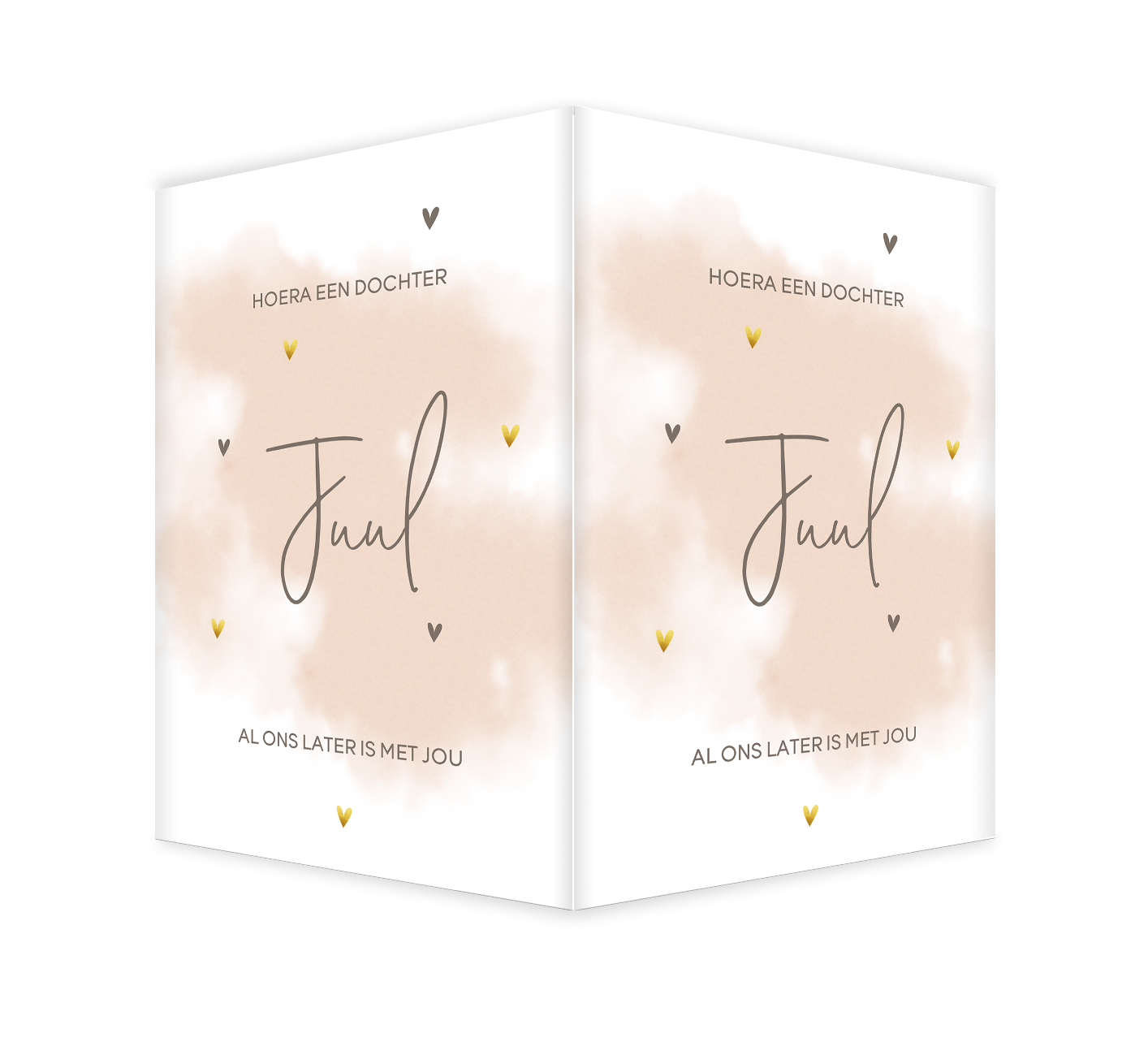 Dit mooie geboortebord is perfect voor de aankondiging van je pasgeboren dochter. De roze waterverf matcht mooi met de goudkleurige en bruine hartjes. De naam van je dochter staat groot in het midden van beide zijdes. Bovenaan het bord staat: 'hoera een dochter' en onderaan: 'Al ons later is met jou'. Pas het bord zelf aan met onze designtool.