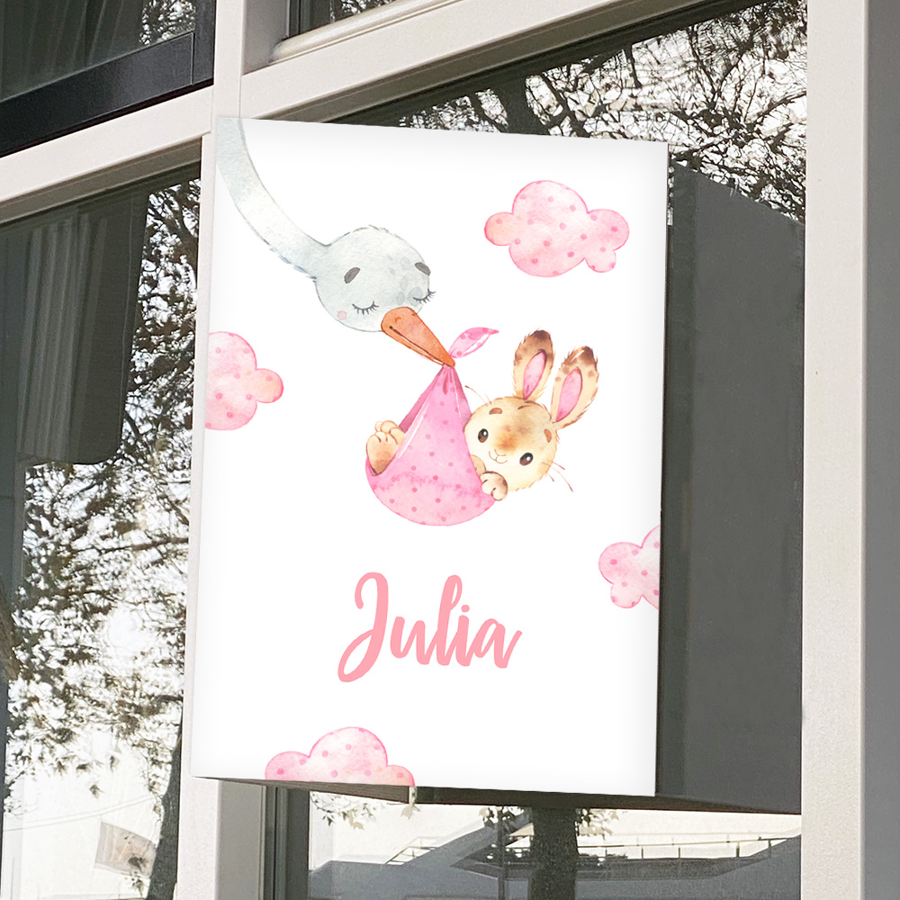Makelaarsborden zijn helemaal hip. Als vervanger van de ooievaar plak je een mooi geboortebord aan je raam. Met dit ontwerp blijven we trouw aan de ooievaar. Op het bord zie je een ooievaar met een knapzak met baby konijntje. De roze wolkjes maken het helemaal af.