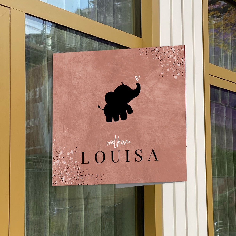 Dit vierkante, roze geboortebord van 50x50 cm met silhouet olifantje en klassieke naam past perfect bij dit geboortekaartje. Bevestig dit geboortebord op het raam en de hele buurt weet gelijk dat er bij jullie een meisje geboren is.