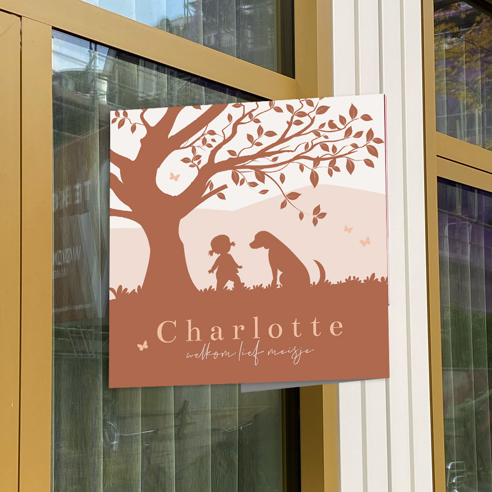 Dit vierkante raambord van 50x50 cm met silhouet meisje en hond onder een grote boom past perfect bij dit geboortekaartje. Bevestig dit geboortebord op het raam om de hele buurt te laten weten dat er bij jullie een kleine meid geboren is. Pas dit bord aan naar eigen wens in onze handige editor.