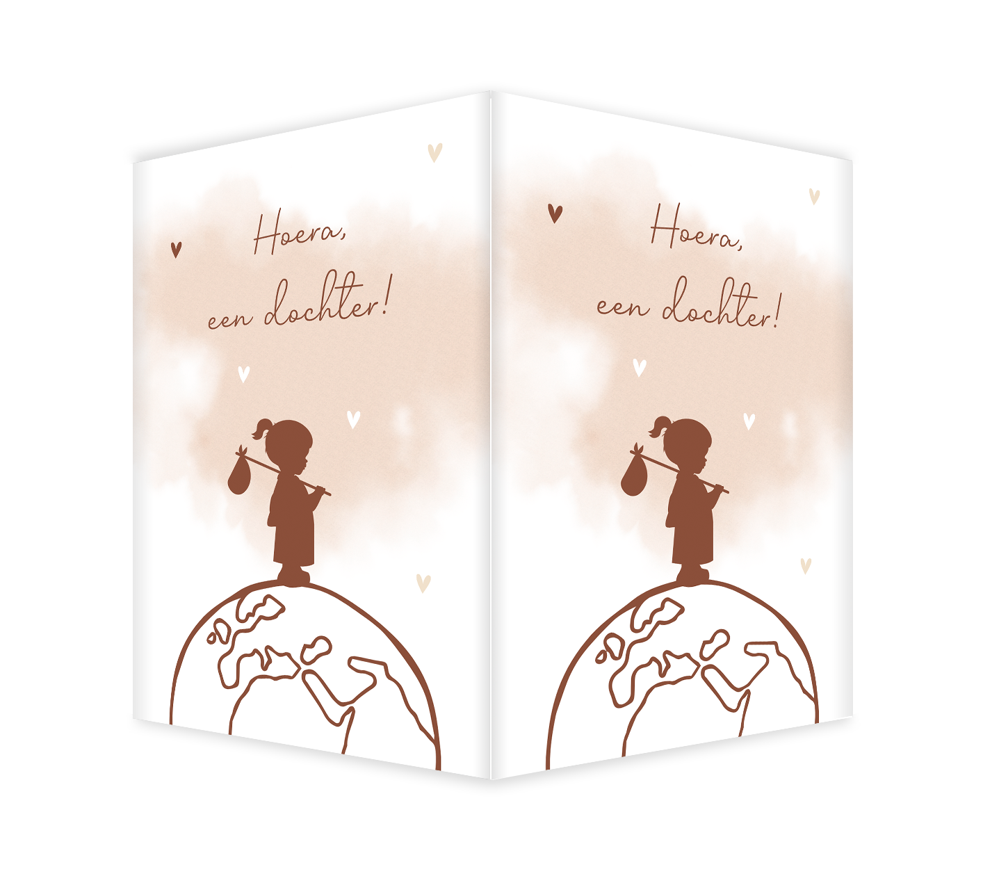 Stoer geboortebord met roestrode kleur. Je ziet een lief silhouet van een meisje met een knapzak op een wereldbol. De roze waterverf maakt het kaartje extra dromerig. Het ontwerp is versierd met roze hartjes. Dit algemene bord heeft de tekst 'Hoera een dochter!' bovenaan en kun je al voor de geboorte bestellen. Wil je de naam erop? Pas dit bord zelf nog aan met de designtool.