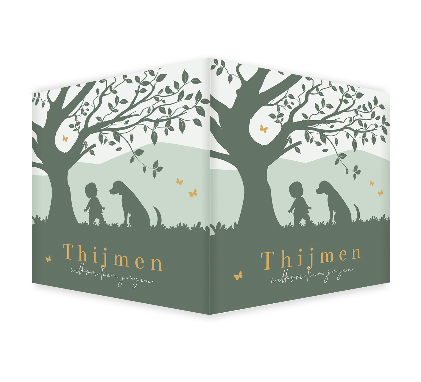 Dit vierkante raambord van 50x50 cm met silhouet jongen en hond onder een grote boom past perfect bij dit geboortekaartje. Bevestig dit geboortebord op het raam om de hele buurt te laten weten dat er bij jullie een kleine jongen geboren is. Pas dit bord aan naar eigen wens in onze handige editor.