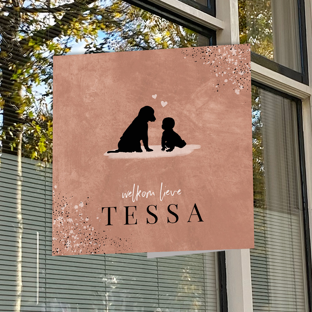 Dit vierkante, terra geboortebord van 50x50 cm met silhouet kindje en hondje past perfect bij dit geboortekaartje. Bevestig dit geboortebord op het raam en de hele buurt weet gelijk dat er bij jullie een kindje geboren is.