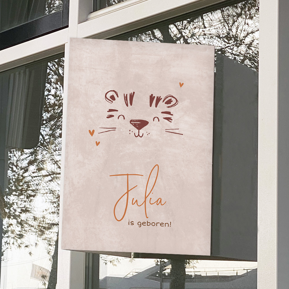 Dit staande, zachtroze geboortebord van 40x60 cm met een stoer tijgertje past perfect bij dit geboortekaartje. Bevestig dit geboortebord op het raam en de hele buurt weet gelijk dat er bij jullie een meisje geboren is.