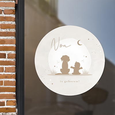 Kondig de komst van je lieve kindje aan met deze beige, ronde raamsticker. Plak deze sticker op het raam zodat iedereen weet: hier is een kindje geboren! Deze sticker is zelf te personaliseren in onze editor en heeft een formaat van ø60 cm.