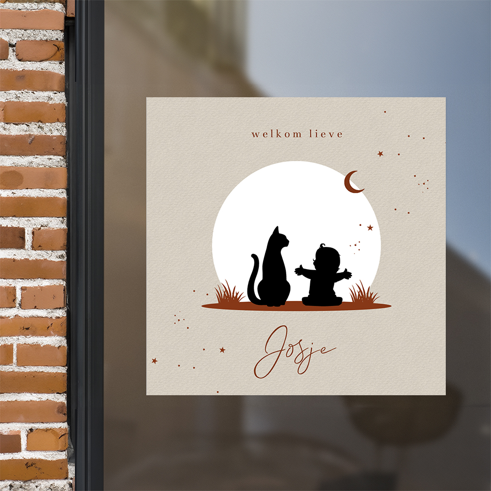 Deze vierkante raamsticker van 40x40 cm met poesje en baby past perfect bij dit geboortekaartje. Plak deze sticker op het raam en de straat weet gelijk dat er bij jullie een kindje geboren is.