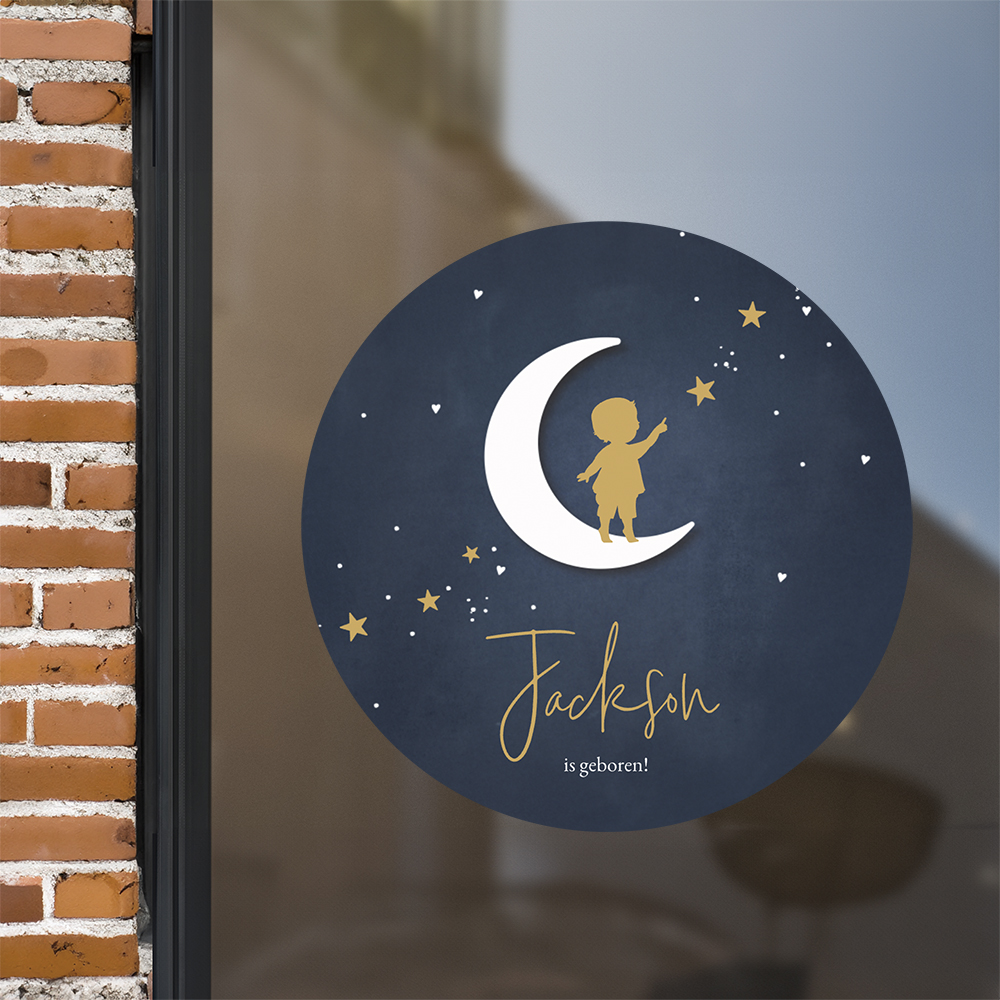 Wordt er binnenkort een jongetje geboren? Plak dan deze donkerblauwe sticker van ø60 cm met jongetje op de maan aan het raam. Bestel 'm vooraf of direct na de geboorte met datum.