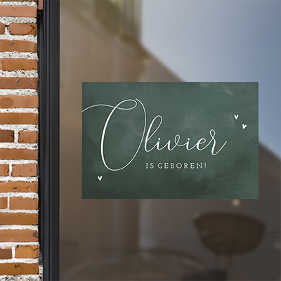 Kondig de geboorte van jullie zoon bij jou in de wijk aan met deze donkergroene raamsticker met sierlijke naam en hartjes. Pas de raamsticker eenvoudig aan in de editor. De raamsticker heeft een formaat van 60x40 cm.