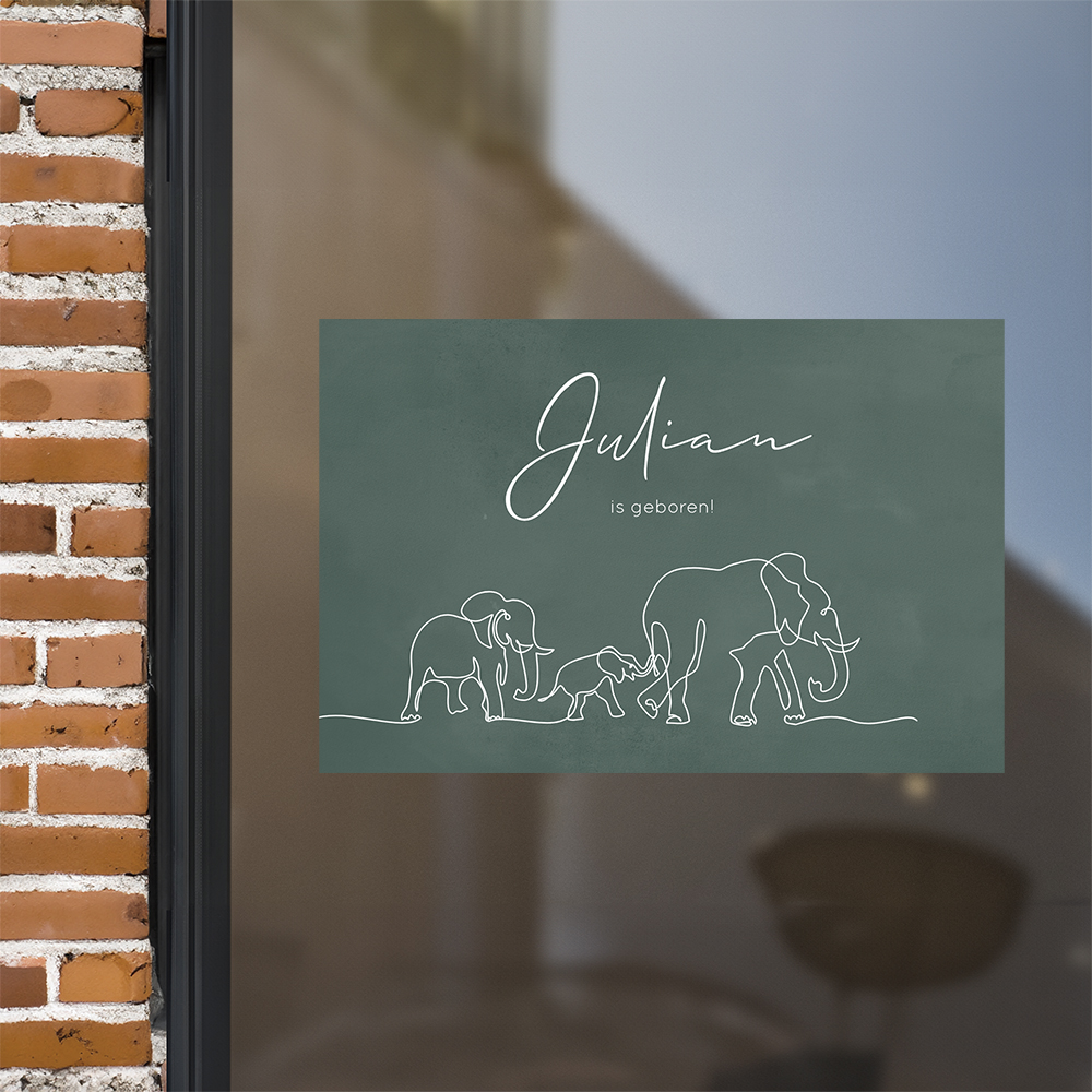 Wordt er binnenkort bij jullie een derde kindje geboren? Plak dan deze groene waterverf sticker van 60x40 cm met drie olifantjes op het raam. Zo laat je de straat op een leuke manier weten dat jullie derde kindje is geboren.