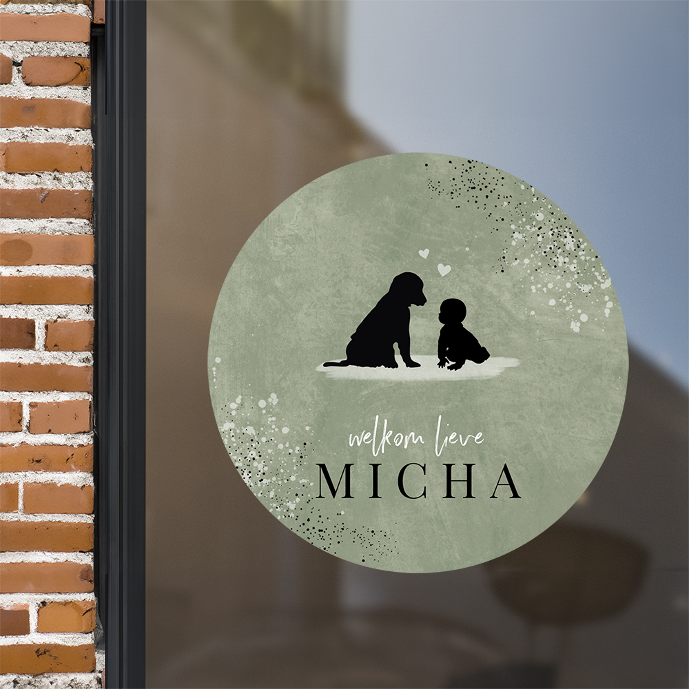 Deze ronde raamsticker van ø60 cm met silhouet hond en baby past perfect bij dit geboortekaartje. Plak deze sticker op het raam en de straat weet gelijk dat er bij jullie een jongen geboren is.