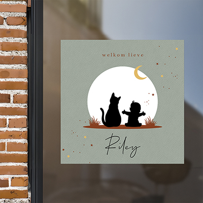Deze vierkante raamsticker van 40x40 cm met silhouet poesje en baby past perfect bij dit geboortekaartje. Plak deze sticker op het raam en de straat weet gelijk dat er bij jullie een kindje geboren is.