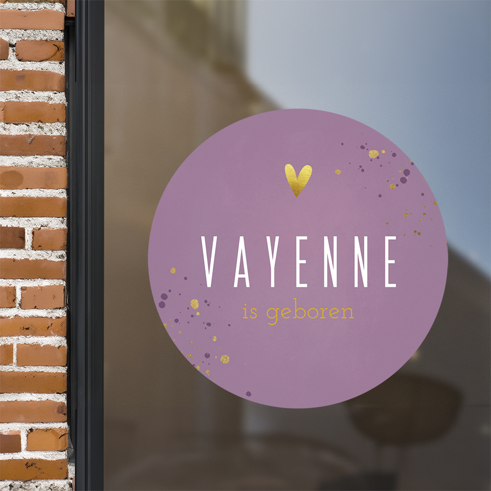 Een leuke raamsticker in vrolijke paarse kleur met stoere naam en goudlook hartje. Kondig de komst van je dochtertje aan met dit leuke ontwerp! Pas de sticker eventueel aan in onze handige editor. De raamsticker heeft een formaat van ø60 cm.