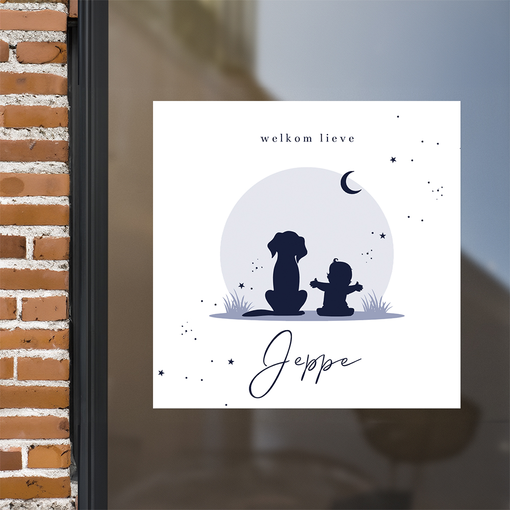 Kondig de geboorte van jullie zoon aan met deze leuke raamsticker met silhouet jongen en hond bij zonsondergang.