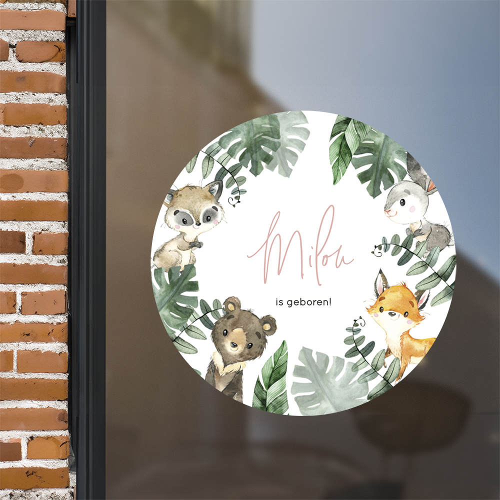 Wordt jullie dochter binnenkort geboren? Bestel dan deze ronde sticker van ø60 cm met bosdieren en plak hem op het raam zodra jullie dochter geboren is. Zo stel je de buren op de hoogte van jullie kleine meid.