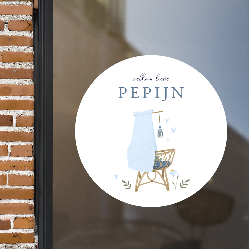 Is jullie zoon geboren? Plak dan deze ronde sticker van ø60 cm met blauw wiegje op het raam. Zo weet de straat gelijk dat jullie zoontje geboren is.