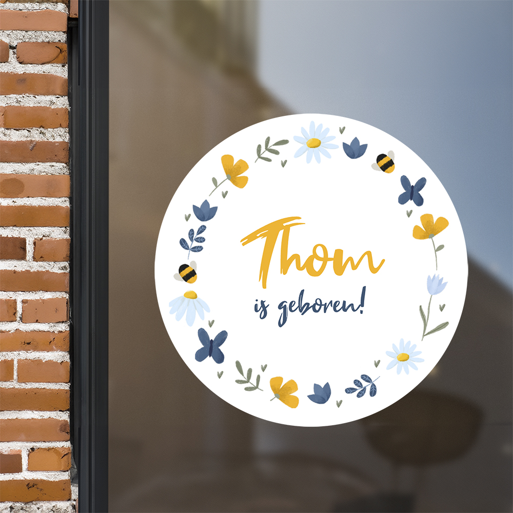 Krijg je in de lente of zomer een zoontje? Laat de hele buurt weten dat hij er is met deze vrolijke raamsticker! De sticker wordt versierd met lieve illustraties van bloemen, bijtjes en vlinders. De raamsticker heeft een formaat van ø40 cm.