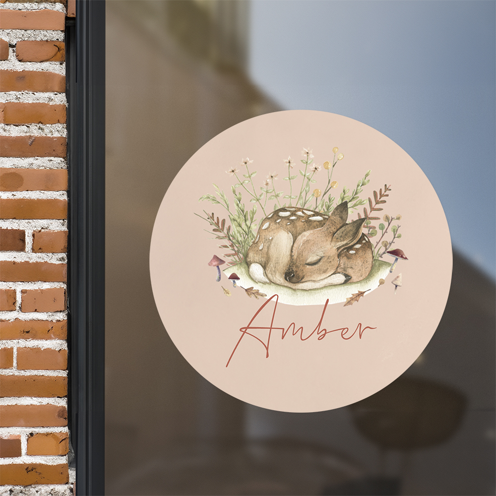 Ronde raamsticker om de geboorte van je dochter aan te kondigen met een lief waterverf hertje. Perfect voor een herfstkindje! De naam staat in roestrode letters en kun je zelf aanpassen met de editor. Deze raamsticker heeft een formaat van ø60 cm.
