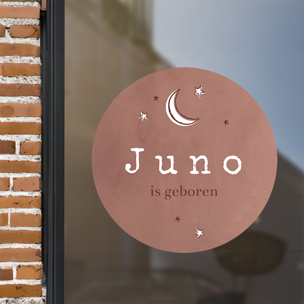 Ronde raamsticker met oudroze achtergrond, maantjes en sterretjes. Een trendy ontwerp om de komst van je dochtertje mee te vieren! Het formaat is ø80 cm en deze raamsticker is zelf aan te passen in onze ontwerptool.