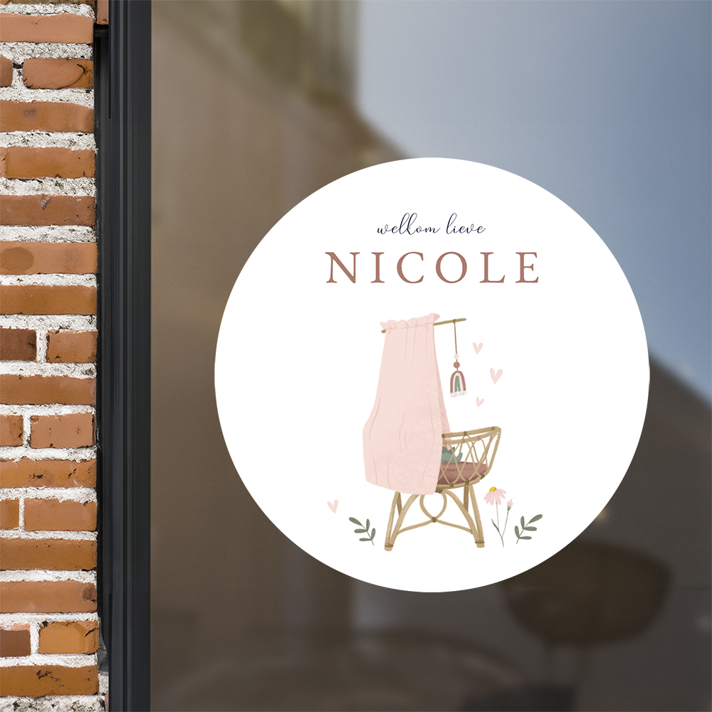 Is jullie dochter geboren? Plak dan deze ronde sticker van ø60 cm met roze wiegje op het raam. Zo weet de straat gelijk dat jullie dochtertje geboren is.