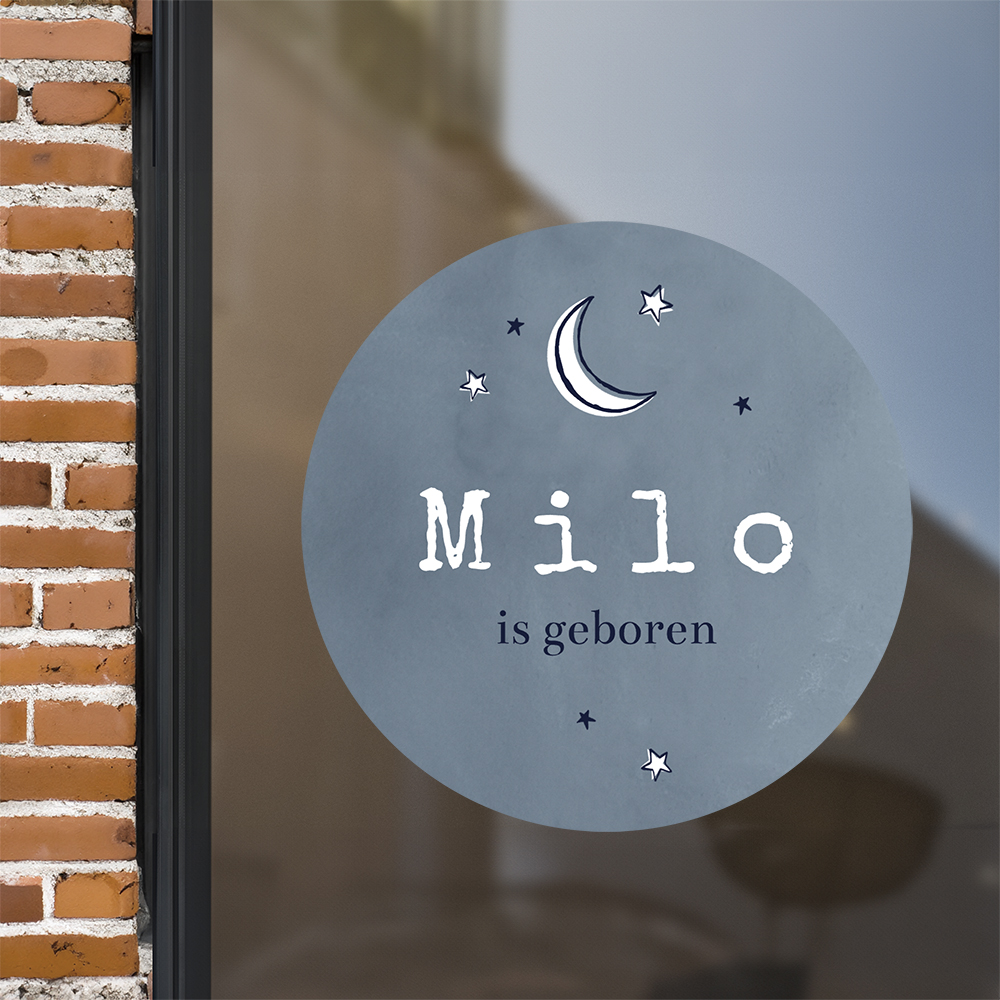 Ronde raamsticker met blauwe achtergrond, maantjes en sterretjes. Een trendy ontwerp om de komst van je zoontje mee te vieren! Het formaat is ø80 cm en deze raamsticker is zelf aan te passen in onze ontwerptool.