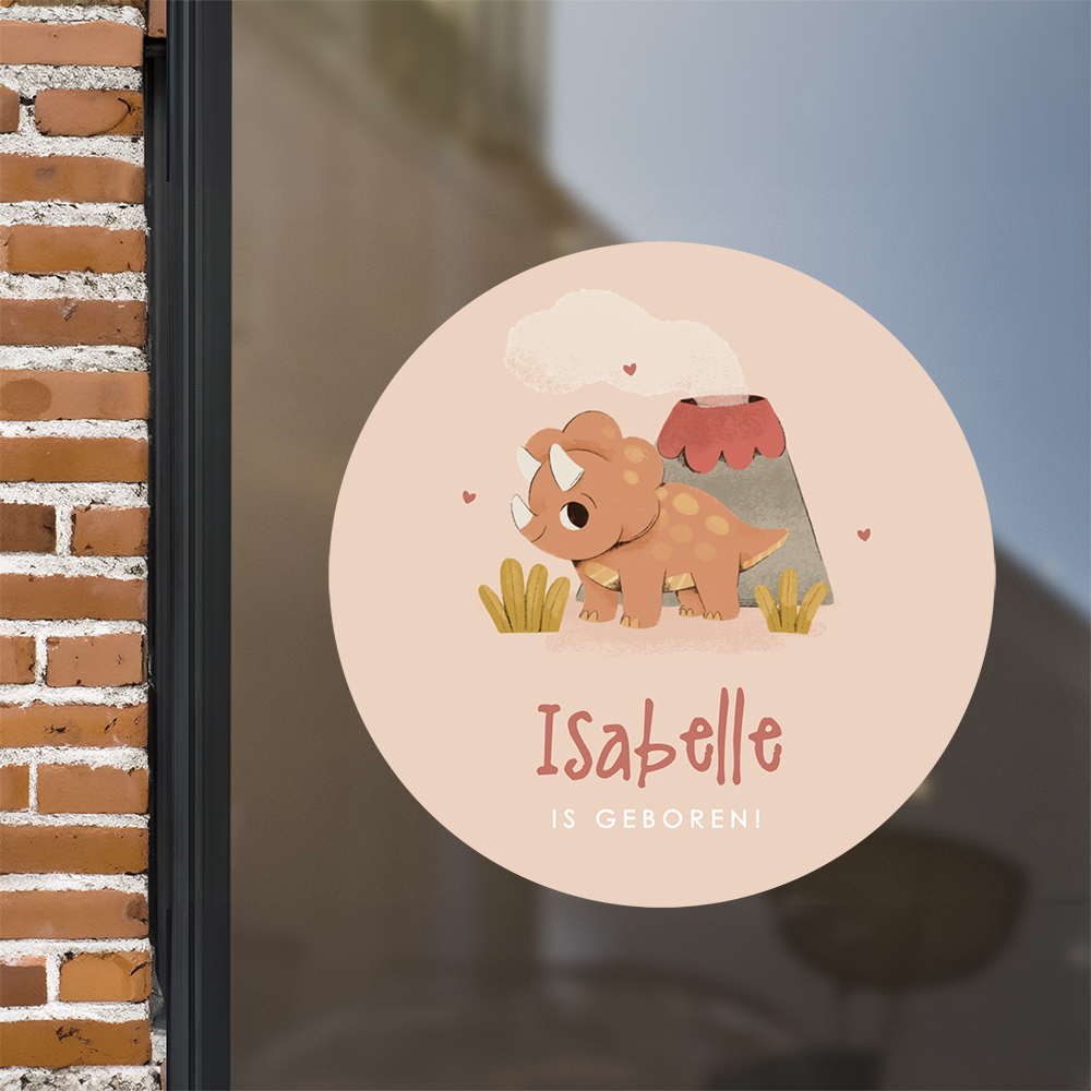 Leuke raamsticker met oranje dinosaurus om de geboorte van jullie dochter aan te kondigen in de straat. Bestel deze sticker van ø60 cm vooraf of direct na de geboorte met datum.