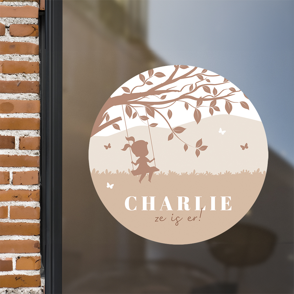 Een lieve ronde raamsticker met zalmroze landschap en schommelend meisje. De boom en vlindertjes maken het tot een vrolijk geheel. Pas deze raamsticker eenvoudig aan in de ontwerptool. De raamsticker heeft een formaat van ø60 cm.