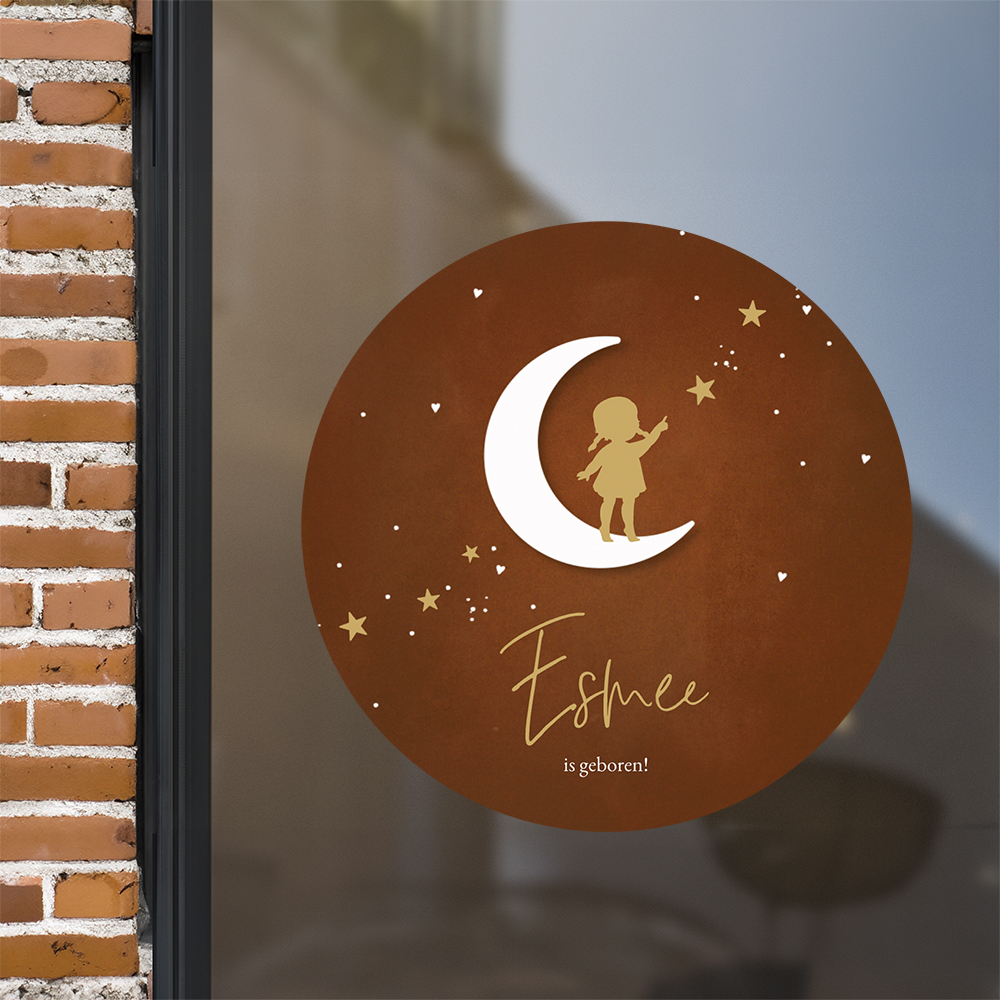 Wordt er binnenkort een meisje geboren? Plak dan deze roestbruine sticker van ø60 cm met meisje op de maan aan het raam. Pas de raamsticker eenvoudig aan in de editor. Bestel 'm vooraf of direct na de geboorte met datum.