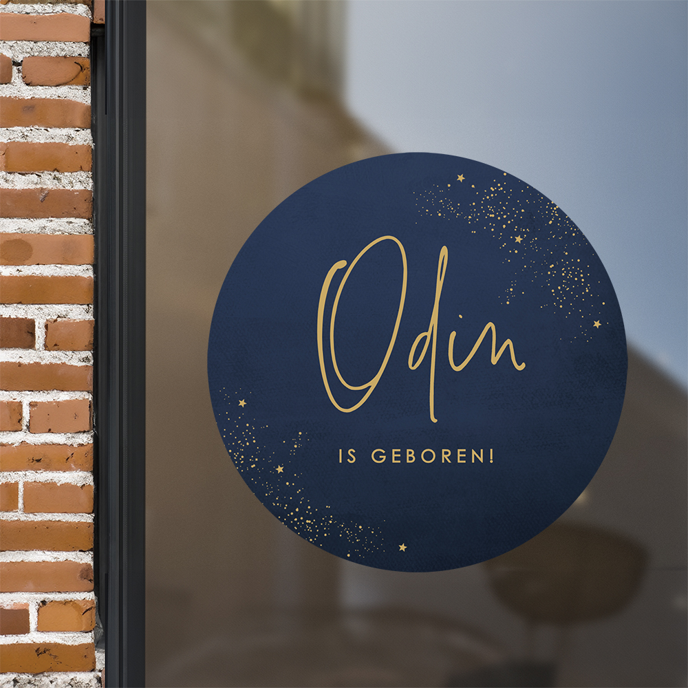 Ronde donkerblauwe raamsticker van ø80 cm met okergele sterretjes. Maak de geboorte van jullie kleine wondertje bekend met een deze leuke raamsticker Bestel 'm vooraf of direct na de geboorte met datum.