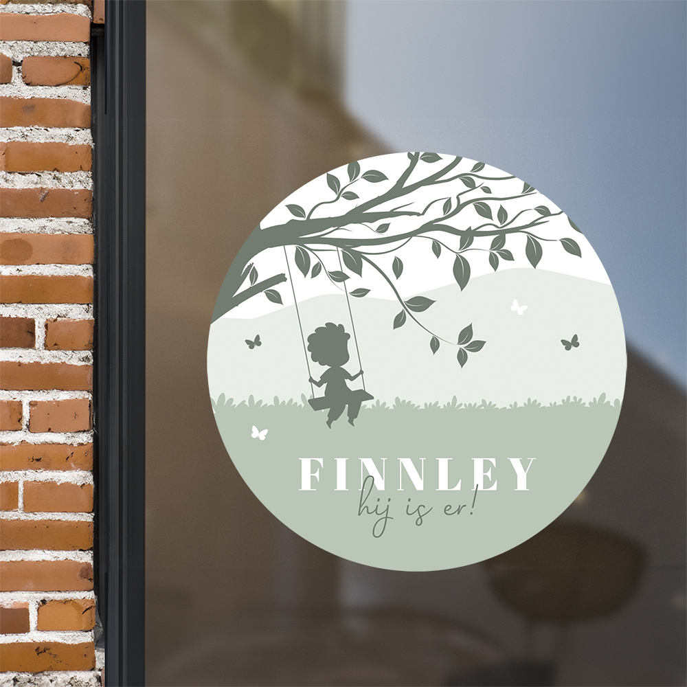 Een lieve ronde raamsticker met groen landschap en schommelend jongetje. De boom en vlindertjes maken het tot een vrolijk geheel. Pas deze raamsticker eenvoudig aan in de ontwerptool. De raamsticker heeft een formaat van ø60 cm.