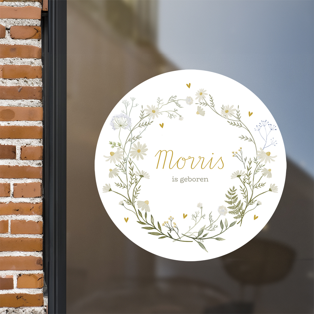 Deze ronde raamsticker van ø60 cm met cirkel van witte droogbloemen past perfect bij dit geboortekaartje. Plak deze sticker op het raam en de straat weet gelijk dat er bij jullie een jongetje geboren is.