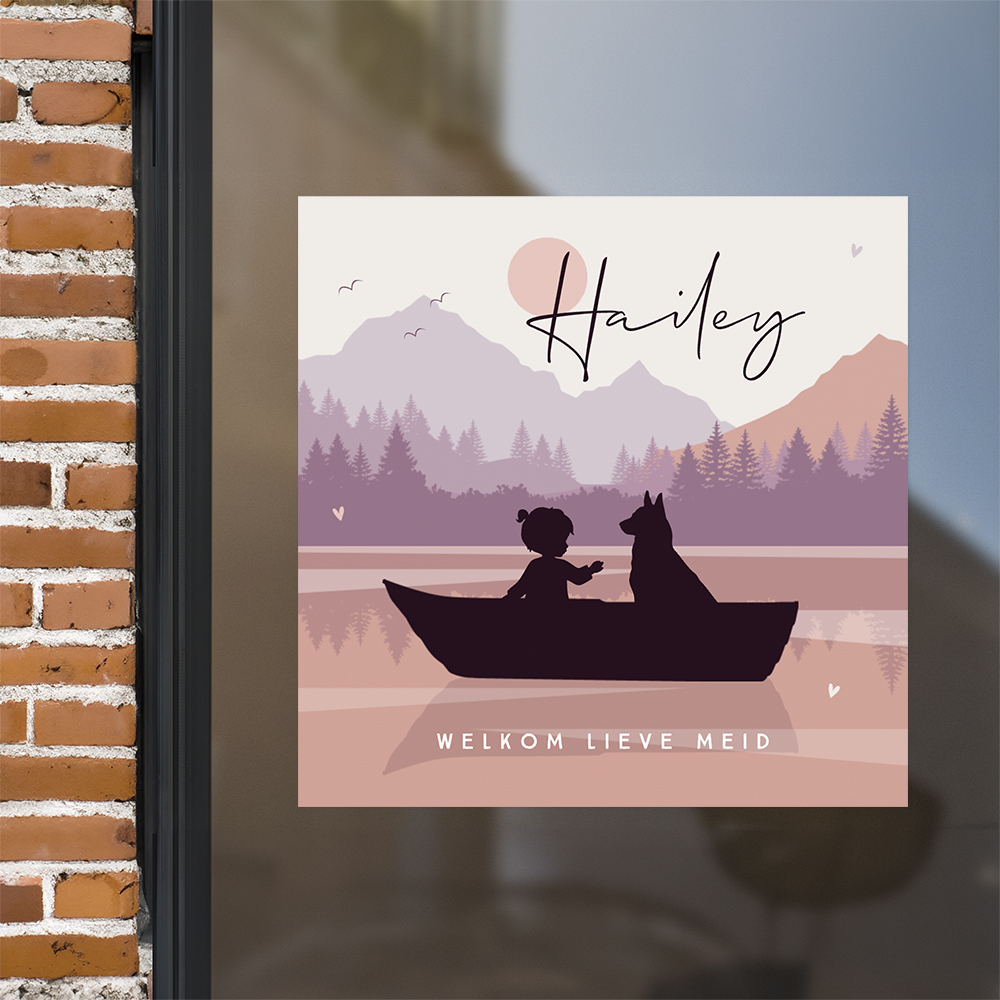 Deze vierkante raamsticker van 60x60 cm met hondje en baby in bootje past perfect bij dit geboortekaartje. Plak deze sticker op het raam en de straat weet gelijk dat er bij jullie een meisje geboren is.