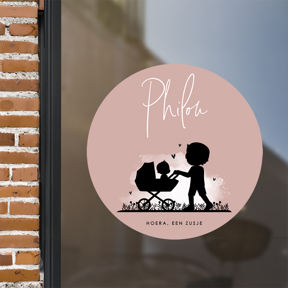 Deze ronde raamsticker van ø60 cm met grote broer en kinderwagen met zijn kleine zusje past perfect bij dit geboortekaartje. Kies eventueel voor een grote zus in onze map 'Silhouet familie' in onze editor. Plak deze sticker op het raam en de straat weet gelijk dat er bij jullie een zusje geboren is.