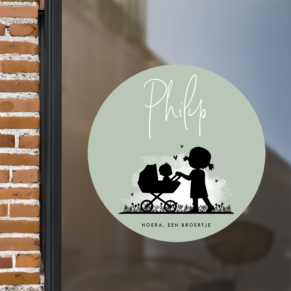 Deze ronde raamsticker van ø60 cm met grote zus en kinderwagen met haar kleine broertje past perfect bij dit geboortekaartje. Kies eventueel voor een grote broer in onze map 'Silhouet familie' in onze editor. Plak deze sticker op het raam en de straat weet gelijk dat er bij jullie een broertje geboren is.