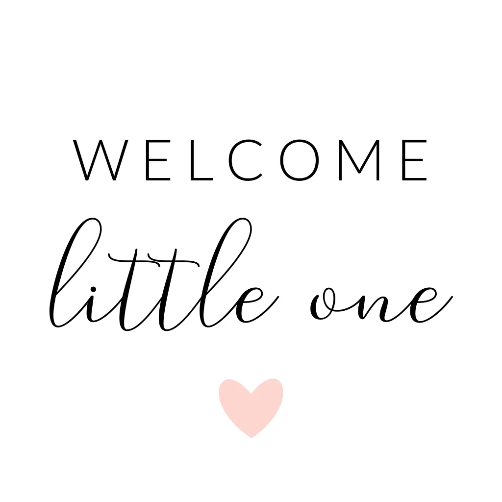 Witte sluitsticker met de tekst 'welcome little one' in een stijlvolle lettertype en een roze hartje. Gebruik deze sluitsticker om je envelop extra leuk te verzegelen. Pas de sluitsticker naar wens aan in de ontwerptool.